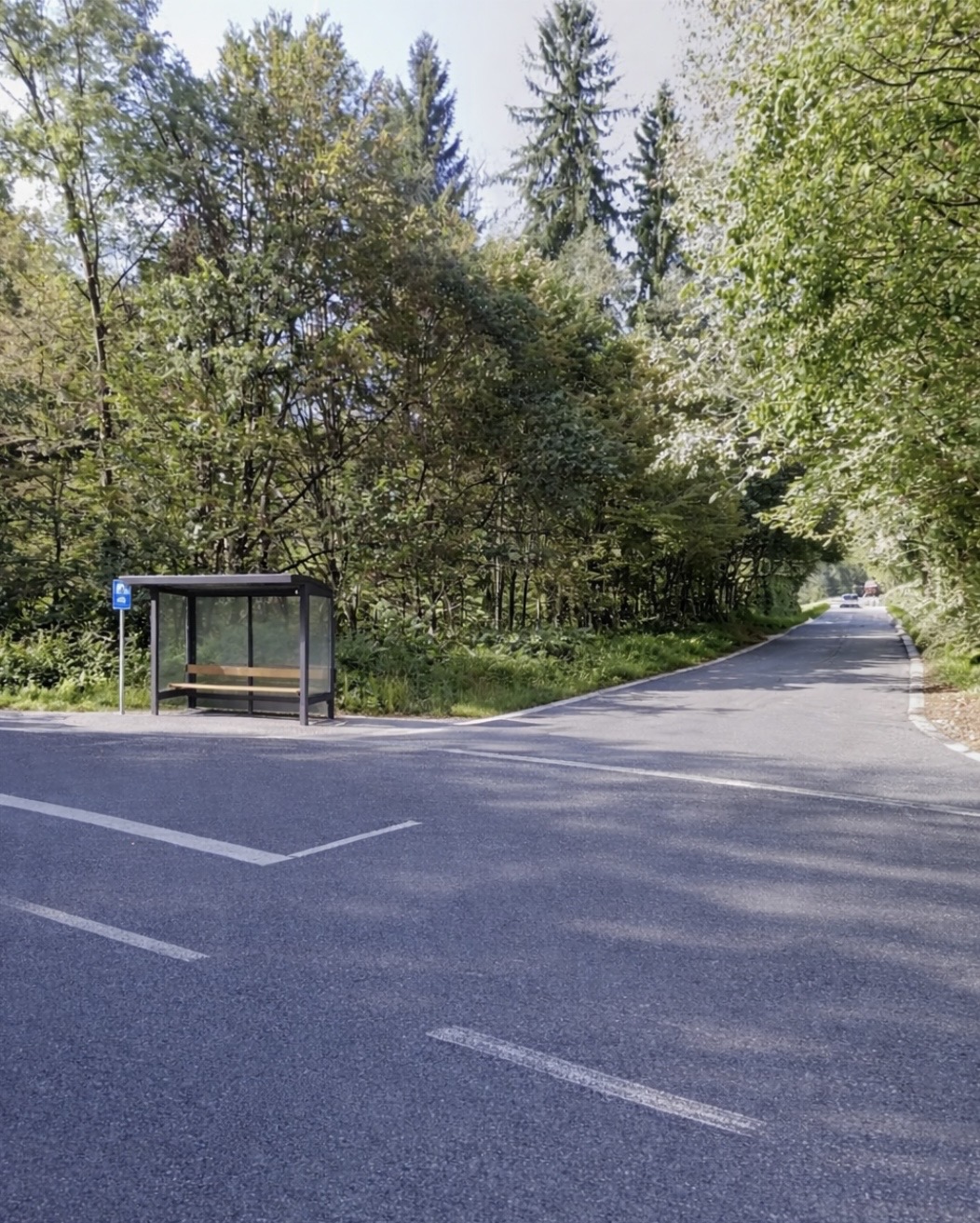 Ni avtobusne postaje s nadstreškom in klopco kjer bi se lahko v primeru dežja in snega ali vetra zadržali do prihoda avtobusa.
